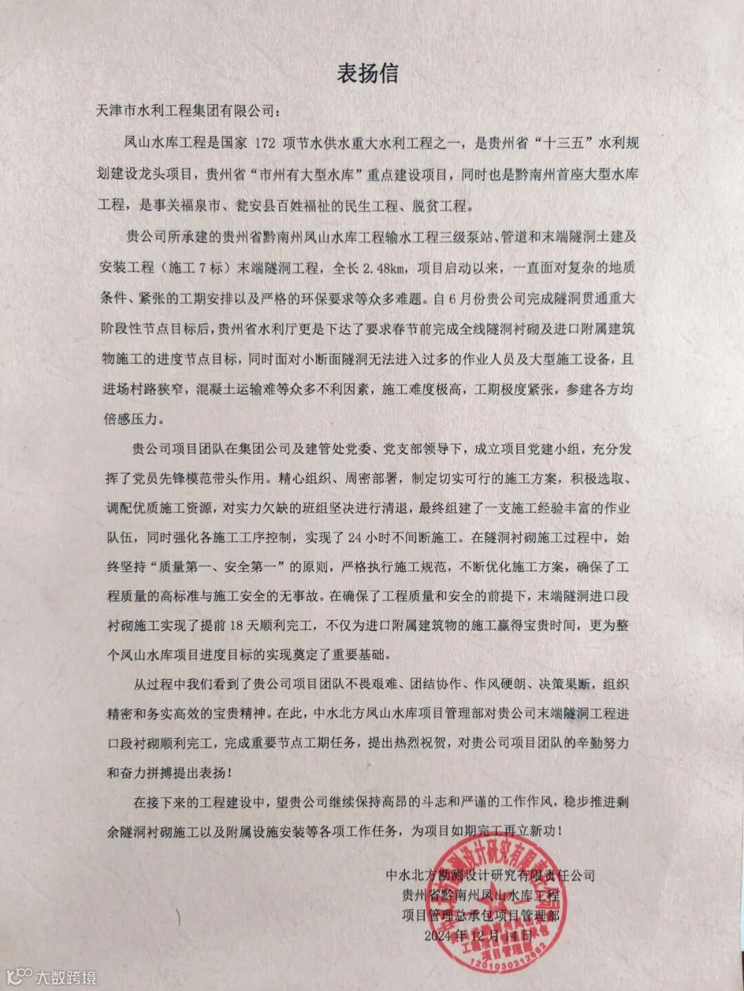 近日,水利集团第三分公司承建的贵州省黔南州凤山水库工程输水工程三级泵站、管道和末端隧洞土建及安装工程(施工7标)项目传来捷报,末端隧洞衬砌工程顺利完工。这标志着水利集团承接的第一个输水长隧洞工程圆满完成,也标志着凤山水库这一惠泽民生的工程向着全面竣工又迈出了坚实的一步。