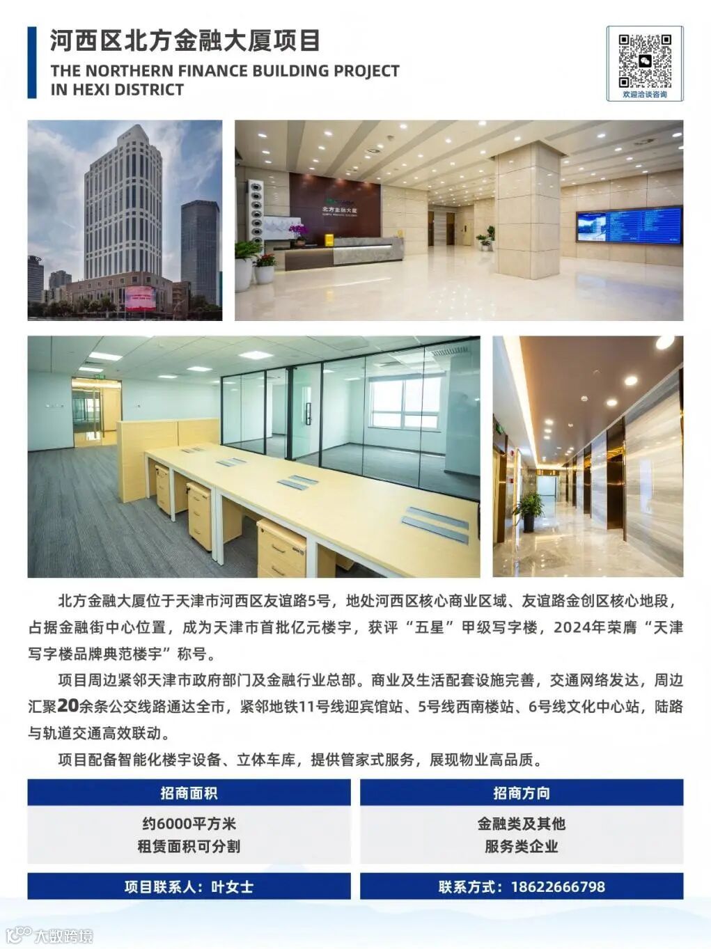 写字楼方面,坐拥北方金融大厦、滨海新区MSD隆泰广场、滨海新区总公司大楼、安徽省亳州市商业项目等多项优质写字楼项目,旗下多项资产获评“五星”甲级写字楼、“天津写字楼品牌典范楼宇”等称号及奖项,商业配套齐备,提供高品质管家式服务,已吸引多家知名企业入驻。其中,亳州商业项目总建筑面积达11.94万平方米(地上面积为10.8万平方米),车位近1000个,诚邀各界合作方入驻。