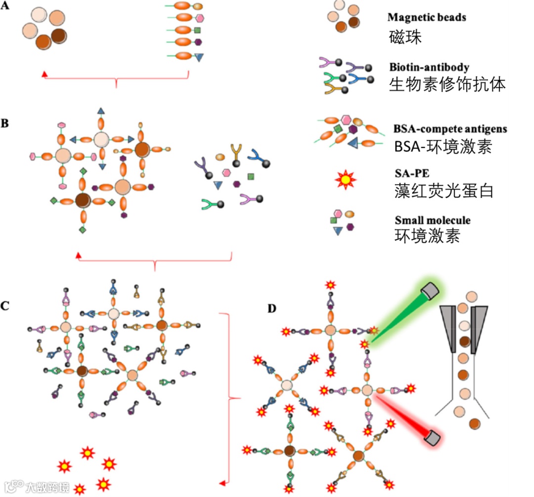 样本、已偶联的磁珠、及可识别环境激素的抗体进行竞争结合