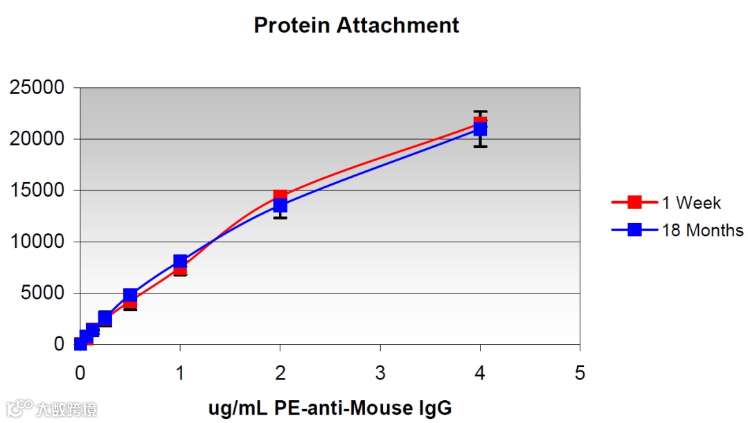 在良好的储放状态下,偶联后的微球可以保持稳定超过一年。从文献上也能找到针对偶联蛋白或是核酸后的微球进行稳定性测试的结果[2-5]。