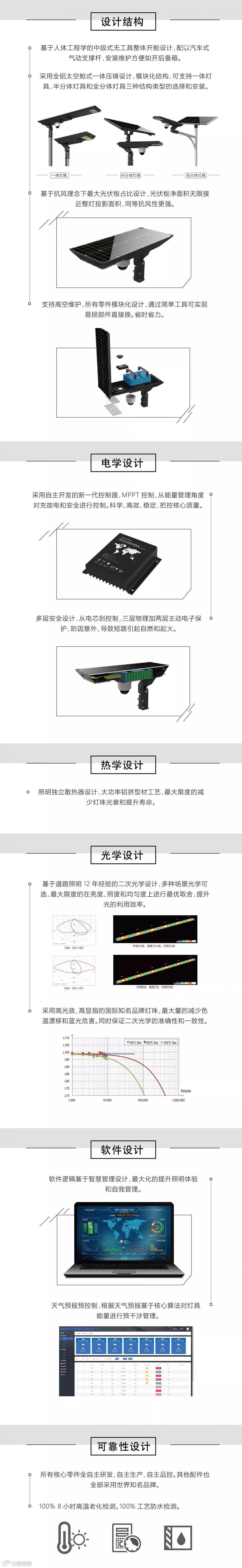 电明科技也在不断努力,顺应社会发展趋势,致力于绿色节能产品开发,基于电明十几年来对太阳能路灯及照明的理解,结合现有最新的技术从能量管理的角度对太阳能路灯进行重新定义,并从结构学、光学、电学、热学、美学、通讯、智慧控制、可维护性等各个涉及的领域进行产品革新,打造出一款真正的全面革新产品——S5系列太阳能路灯(以下简称S5)。