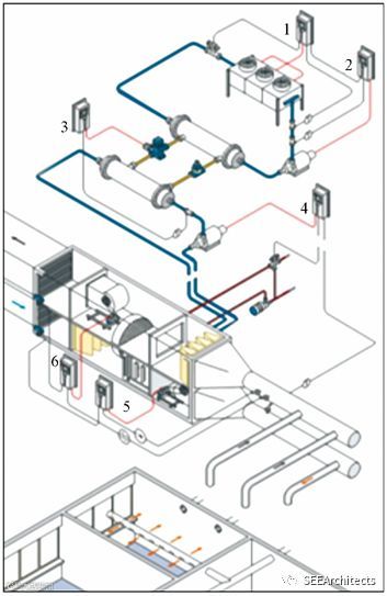 进气、回气都经过空气处理单元。整个系统由控制台远程控制进气的温/ 湿度 通过温度调节装置测量各个房间的温度,直接控制房间的气阀 变频器通过控制空气流量,保持管道压力恒定。