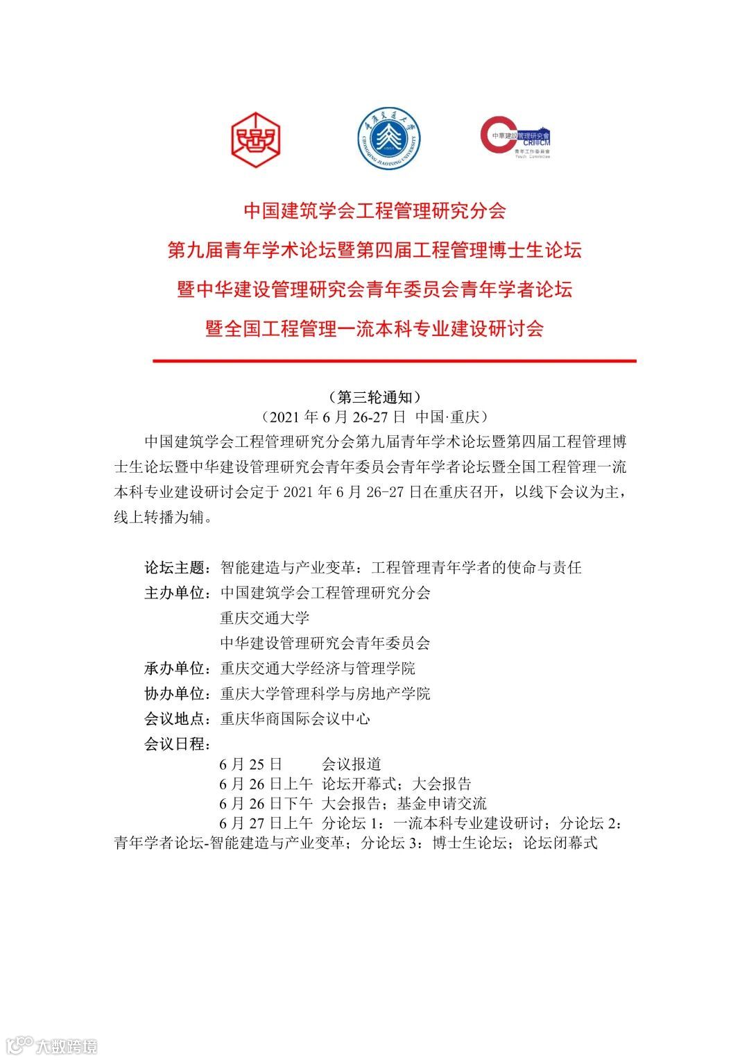 中国建筑学会工程管理研究分会第九届青年学术论坛暨第四届工程管理博士生论坛暨中华建设管理研究会青年委员会青年学者论坛暨全国工程管理一流本科专业建设研讨会定于2021年6月26日-27日在重庆召开。