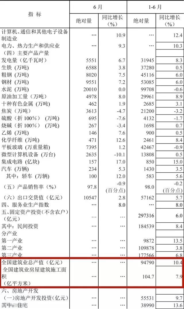 7月16日,国家统计局公布了上半年全国经济运行情况。经初步核算,上半年国内生产总值418961亿元,按可比价格计算,同比增长6.8%。其中,上半年全国建筑业总产值94790亿元,增长10.4%,全国建筑业房屋建筑施工面积104.7亿平方米,增长7.9%。
