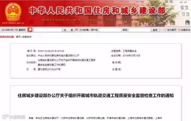 5月16日,住建部办公厅发布《关于组织开展城市轨道交通工程质量安全监督检查工作的通知》。