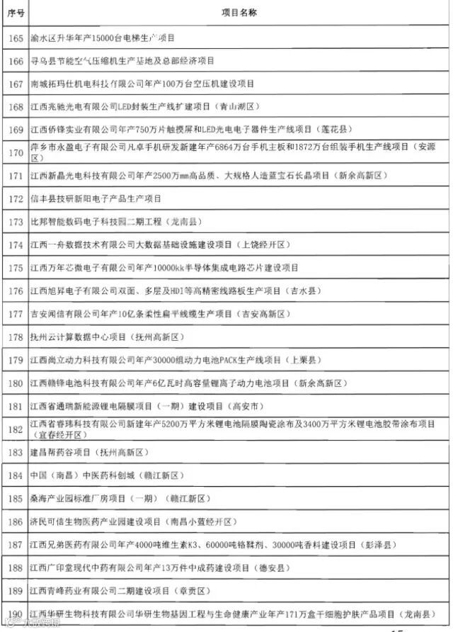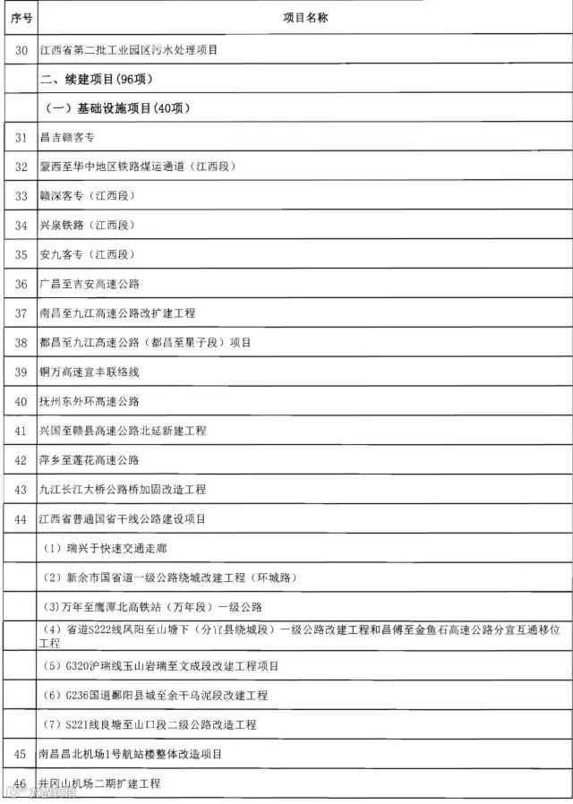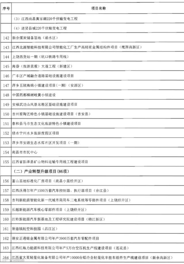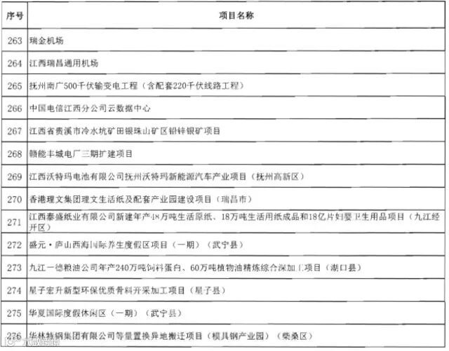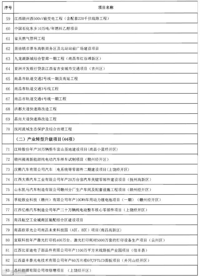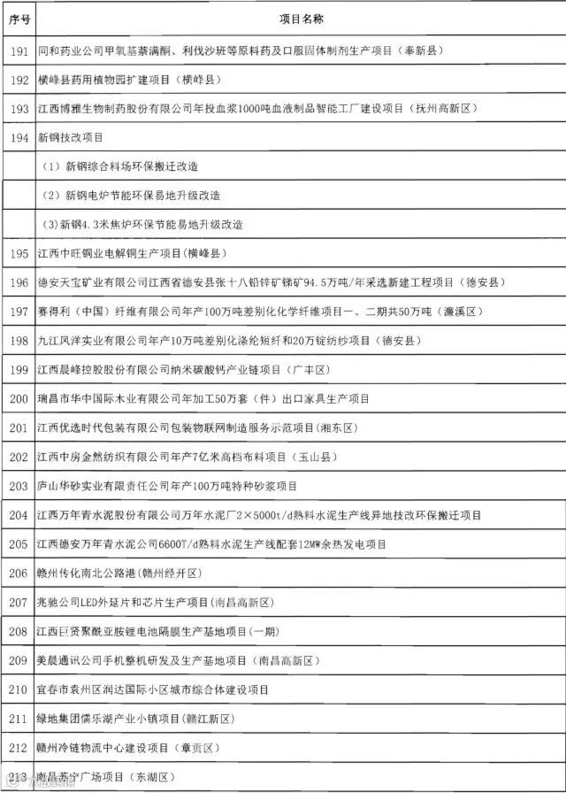 在计划新开工的项目中,基础设施项目有29个,包括昌景黄铁路(江西段)、大广高速南康至龙南段扩容工程、赣皖界至婺源高速公路新建工程、信江航道提升工程和南昌市市民中心项目等;产业转型升级项目86个,包括吉利新能源智能化新一代城市商用车三电系统等零部件项目、江铃新能源汽车新基地及工程研究院建设项目、新钢技改项目等;社会民生项目7个,包括南昌大学附属口腔医院红谷滩分院等;生态环保项目9个,包括吉安市、乐平市生活垃圾焚烧发电项目等。昌九客专、瑞梅铁路(江西段)和长赣铁路(江西段)等19个项目列入今年开工预备项目。