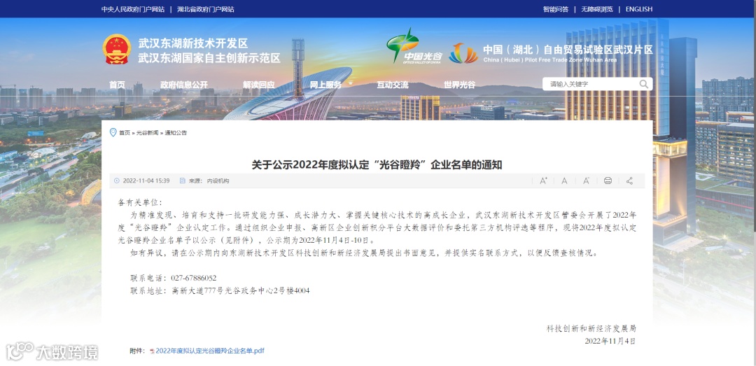 11月4日,武汉东湖新技术开发区科技创新和新经济发展局发布了《关于公示2022年度拟认定“光谷瞪羚”企业名单的通知》。