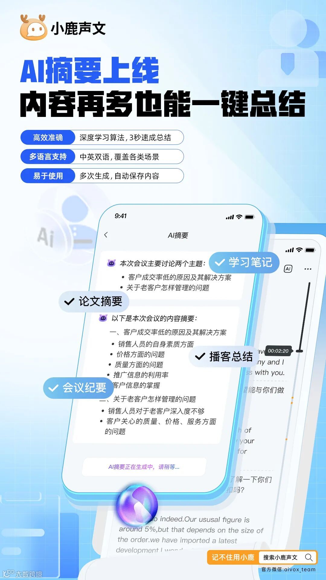 小鹿声文AI摘要目前支持中文和英文,已经涵盖了日常学习和工作中的绝大部分场景,更多语言陆续更新中,敬请期待哦。
