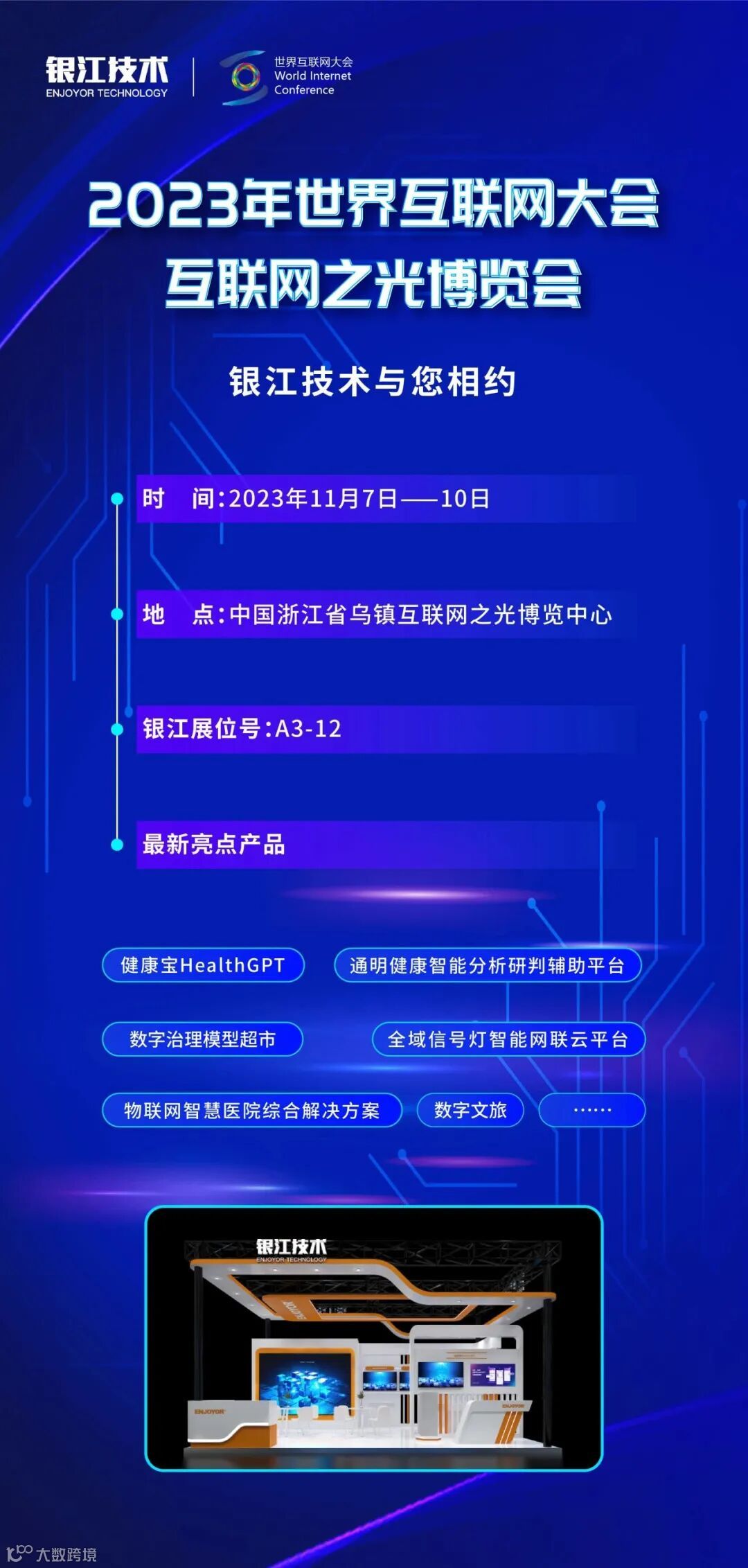 点墨江南,共话世界。11月7日,2023年世界互联网大会正式开幕,本届大会以“建设包容、普惠、有韧性的数字世界——携手构建网络空间命运共同体”为主题,着力促进数实融合,用新动能推动新发展。银江技术受邀亮相本届博览会,为来自全球的观众奉上了一场数智化的科技盛宴。