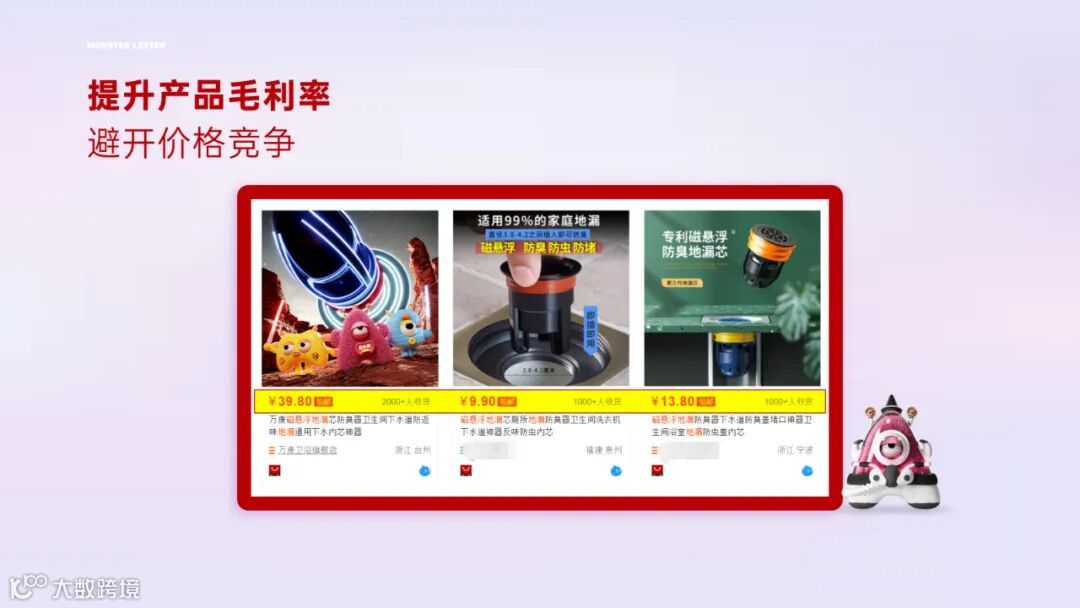 联名IP成果:万康团队在众多IP中选择了以“丑萌”差异化的“字母怪兽”进行类目独家联名,在经过长期的数据沉淀,联名后取得了“毛利率进一步提升”“主图点击率提升”“付费推广金额比例下降“”成功避开同行抄袭“”进一步巩固品牌价值“等多维度的合作成功。