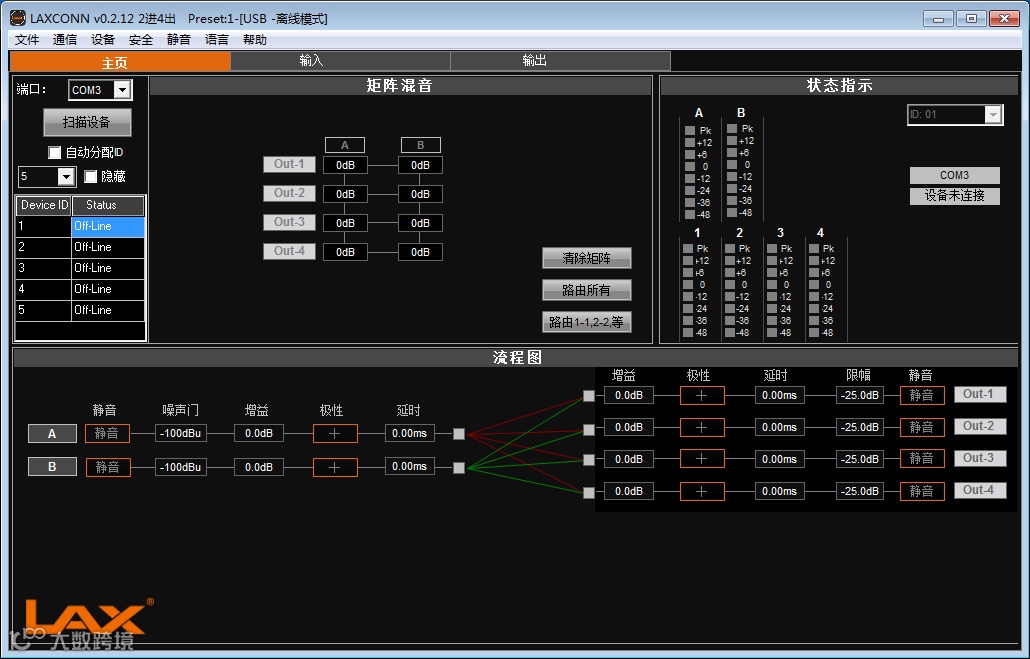 搭配该模块的PC端控制软件-LAX CON,远程调控音箱系统参数,使用时更加灵活方便。LAX CON支持静音、增益、EQ/高低通、限幅、延迟、温度设定、桥接、补偿等参数处理。