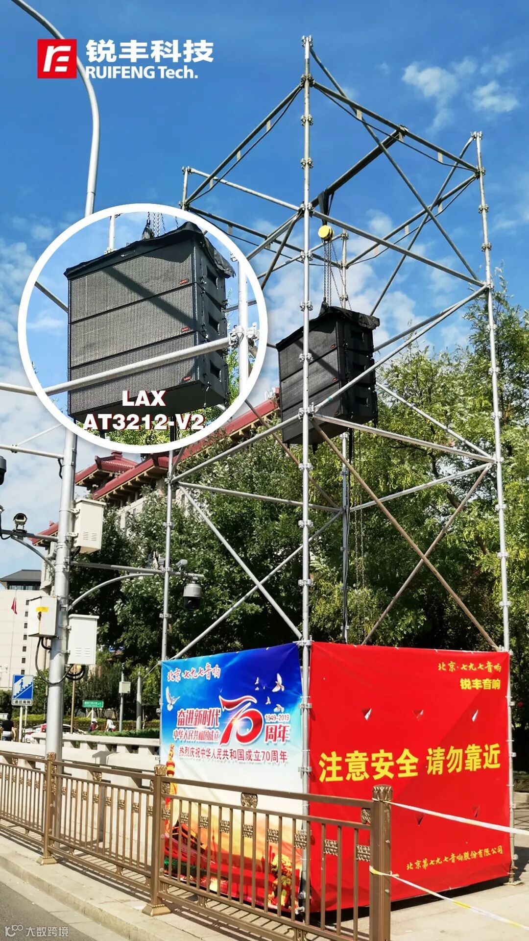 阅兵仪式扩声设备由北京七九七音响股份有限公司、锐丰科技LAX联合提供,现场吊挂18组LAX AT3212-V2全天候线性音箱响彻阅兵方阵上空,为祖国的荣誉发声,本扩声系统由锐丰科技军工事业部设计,安装及调试,而在群众游行、联欢活动,这场空前的群众活动演出扩声系统,由总制作方北京天韵星光文化艺术有限公司携锐丰LAX打造,使用了24组LAX OPD12全频音箱以及OPD218B超低音箱。