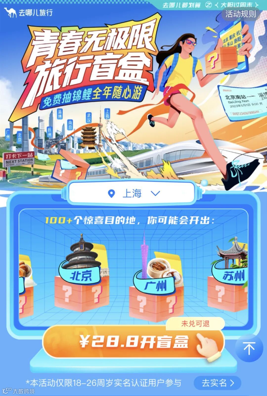 国内知名旅行+购票+酒店一体APP——去哪儿,在近期发布了一款“火车票盲盒”面向18-26岁用户,出发地包含全国22个省会城市和北京、天津、上海、重庆四个直辖市,以及其他70余个二线以下城市。因此,有人因为盲盒开出了热门旅游城市,开始期待即将到来的惊喜之旅。也有人因为抽到从省会城市回老家的离谱车票,在社交媒体上诉说着心里的不甘。