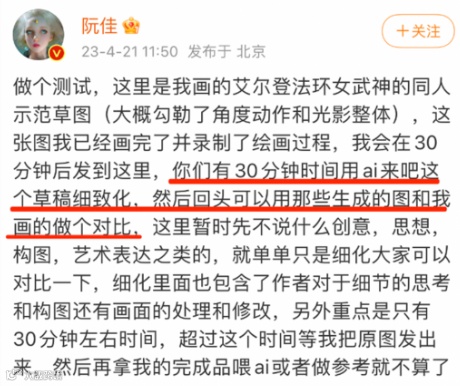 4月21日,阮佳发布了一张艾尔登法环女武神的同人示范草图,测试在限定时间30分钟内,AI能否将草稿细化为成品。