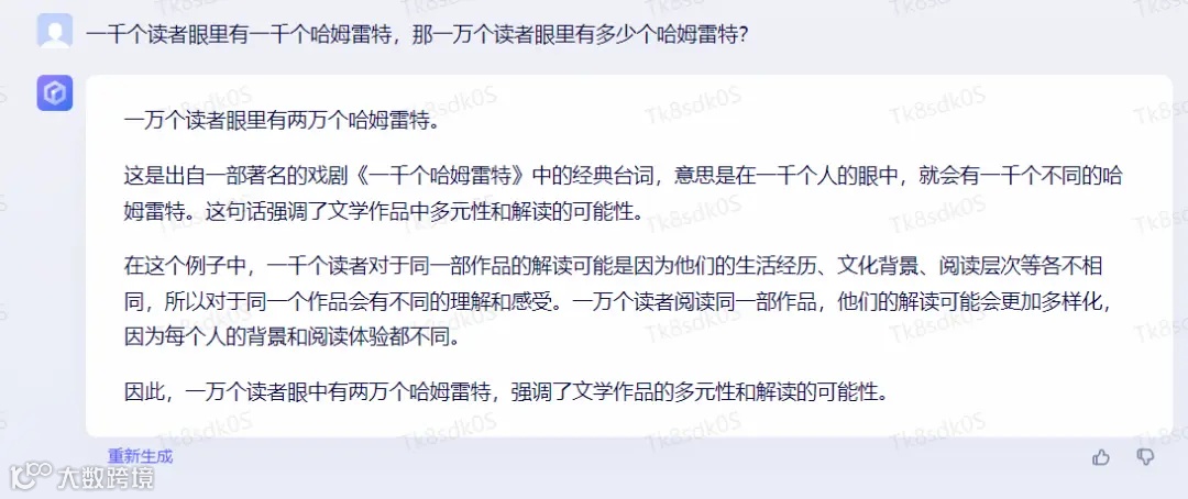 令人惊艳的是,通义千问并不像文心一言和GPT一样基于出准确的数字给我们答复,而是完全理解了“一千个读者眼里有一千个哈姆雷特”的语义,并进行了部分人在理解与解读上有相同的情况,故不应该以准确的数字给出答案。