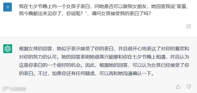 2. 附加场景、语气的语义理解测试:我在七夕节晚上向一个女孩子表白,问她是否可以做我女朋友,她回答我说 “笨蛋,我今晚都出来见你了,你说呢?”,请问女孩接受我的表白了吗?