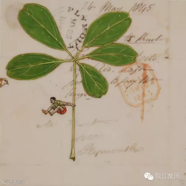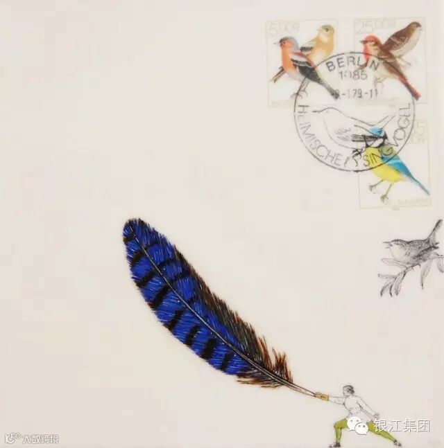 Kenna Moser现居美国贝里布里奇岛,她用从古董店里收集来的邮票、信件、图书、字典,与自然中的碎片,如蕨类植物、羽毛、花卉,在木板上做拼贴,用蜂蜡覆盖后,再用油画进行局部的细致描绘,呼应画面上的已有元素,与植物互动的迷你小人更是憨态可掬,犹如一幅时光的拼贴。
