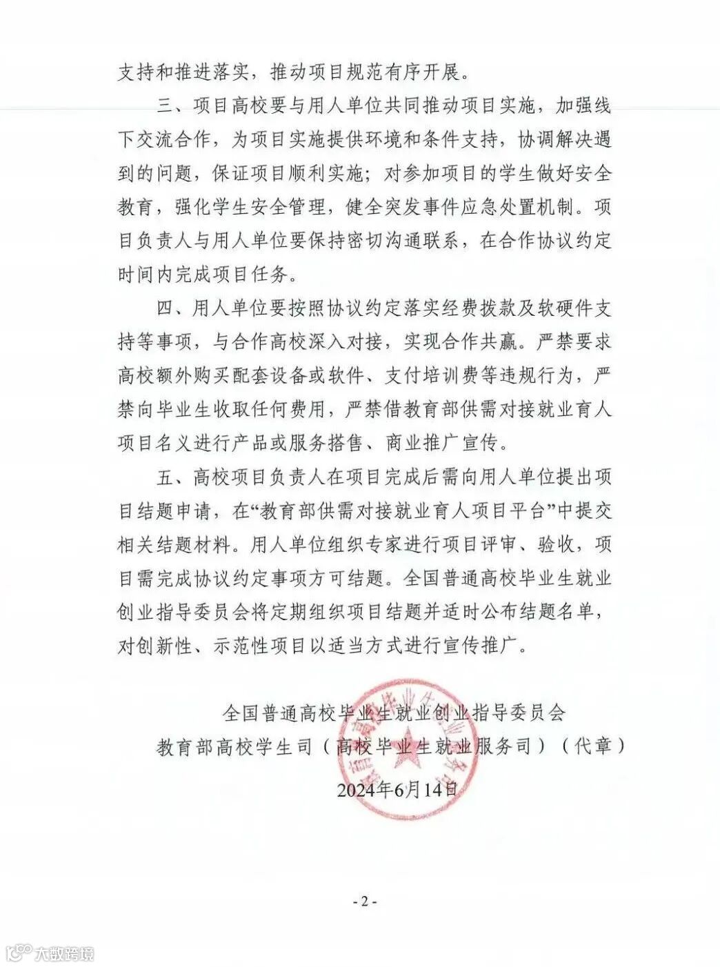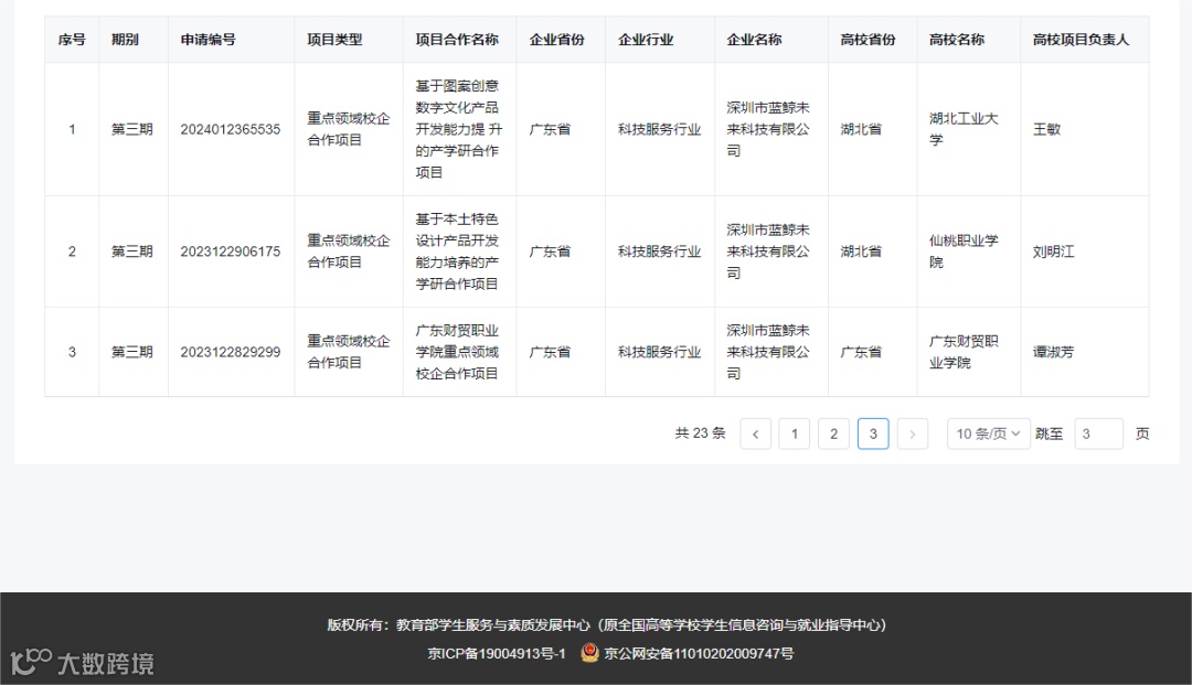 6月14日,教育部高校学生司发布《关于公布教育部第三期供需对接就业育人项目立项名单的通知》(教就业司函〔2024〕23号)。按照工作流程,经高校与用人单位联合申报、专家审核,深圳市蓝鲸未来科技有限公司申报的23个就业实习基地项目全部获批立项。