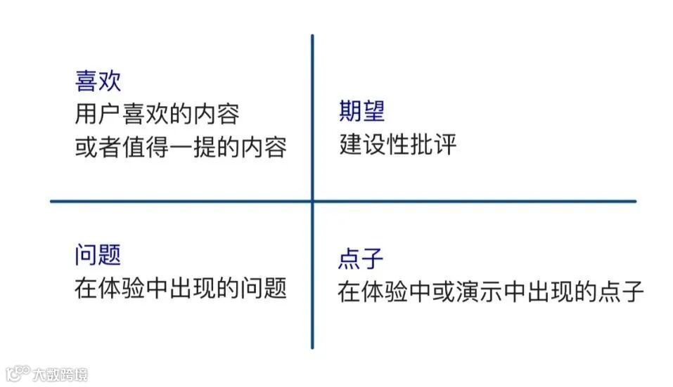 反馈收集表相当有用。它使得记录反馈更加方便,不管是实时反馈还是来自演示和原型的反馈。利用反馈表可以系统地收集反馈,主要有四个象限: