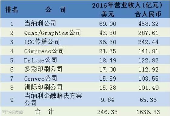 该调查以年度营业收入为排序指标,把北美近400家印刷厂罗列出来并进行了排行。在该榜单在TOP 9中,来自美国的有8家,来自加拿大的有1家。2017年,这9家印刷企业营业收入合计达到246.35亿美元,约合人民币1636.33亿元。总和高出国内印刷百强企业的产值的57.49%。如果以GDP比例来看,在印刷业这方面,中国仍出于落后状态。