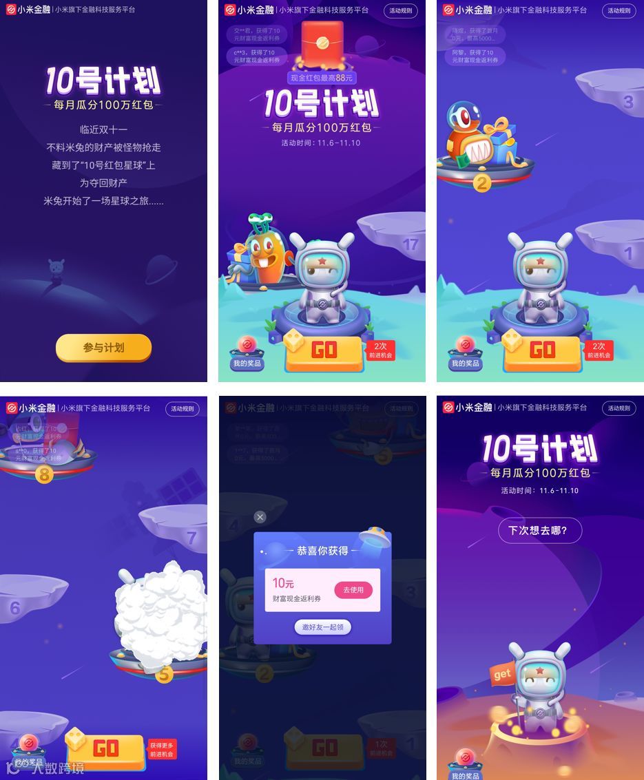 我们也做过很多类似的活动,比如说最近上线的“10号计划”活动,其实也是一个拉新获客的活动,花了一点小心思将它包装成一个比较好玩的游戏,首先是场景带入,用一个小故事将用户带入我们设定的游戏情境,然后抛出主题,抛出最后要达成的目标,再选择掷骰子向上跳格子的方式,让用户有一个视觉上的变化和反馈,其中穿插了一些奖励,刺激用户不断去超越自己,最终分得大红包。