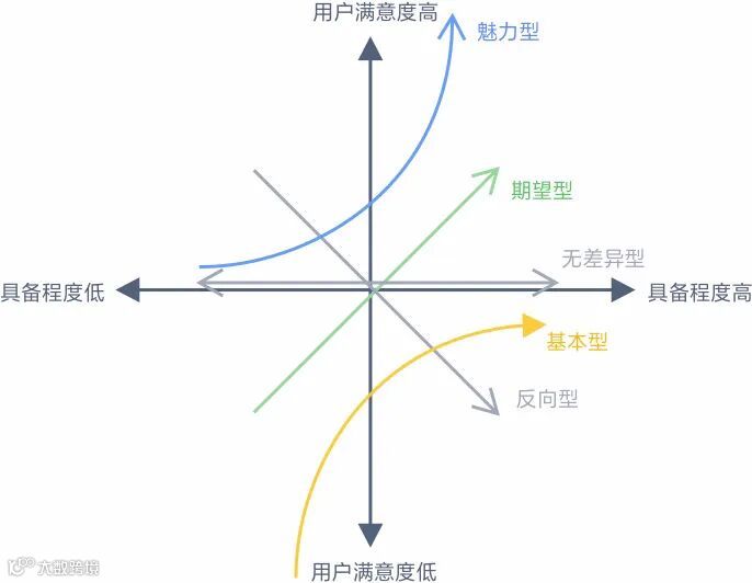 无差异型需求(Indifferent Quality/Neutral Quality):无论提供或不提供此需求,用户满意度都不会有改变,用户根本不在意;
