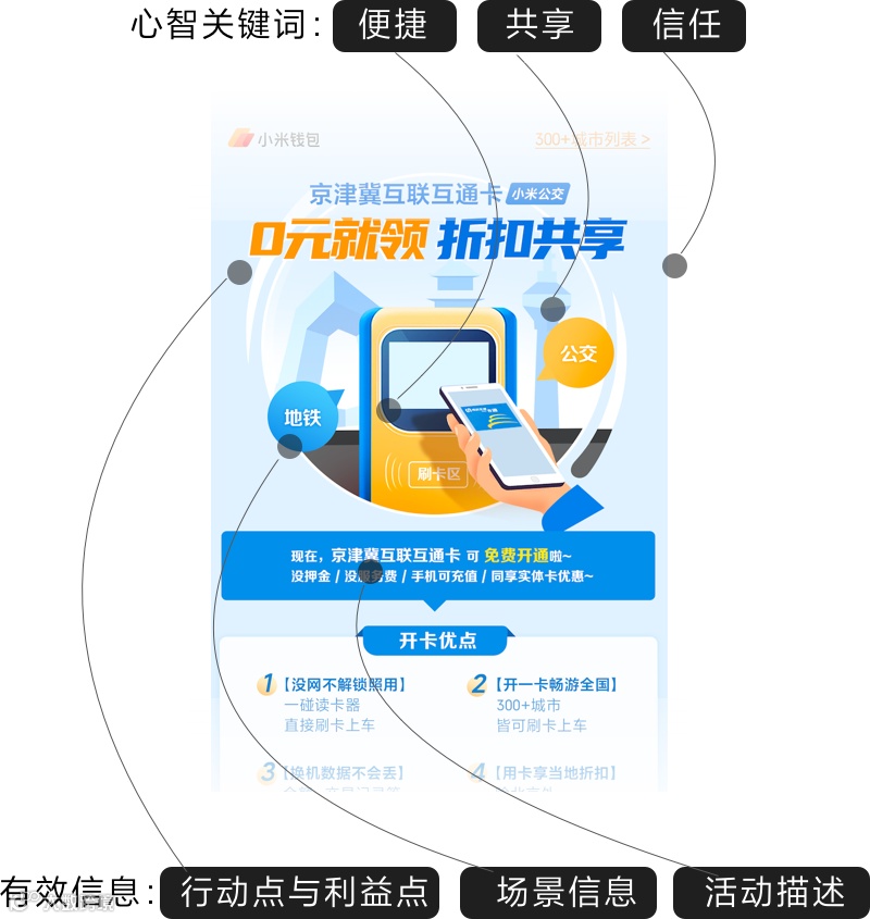 例如我自己的一个项目,小米公交开卡服务,当我了解到,用户对“便捷充值”和“账户信息安全”这两个心理预期的时候,就可以构建出用户想要的情景,从而引出我们建立视角的第二个要素——心智体现。