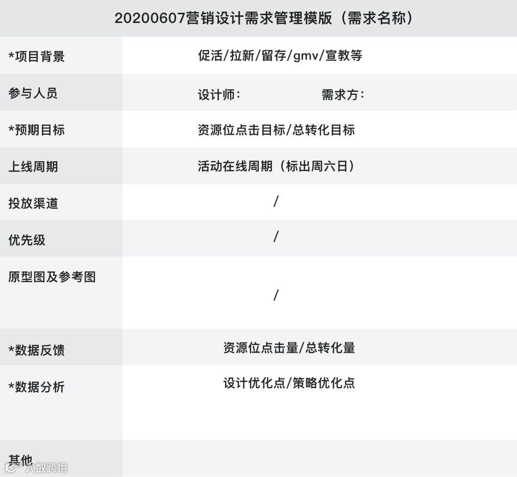 有效的沟通从约定规范开始,设计师都应该针对自己的业务领域,和需求方一起制定设计需求管理模版,列出所有的需求信息项,从需求端到设计端进行诉求转换,并逐项记录,以便于复盘阶段的条例清晰(带*号的为特别注意项)。