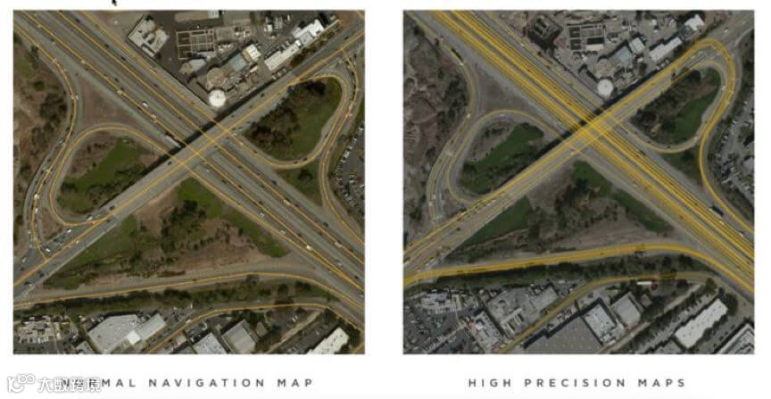 下图左边是普通的低精度导航地图路径,而右边则是特斯拉通过影子模式通过数据积累绘制的高精度导航地图,通过对比可以看出,高精度导航地图可以呈现更详细更丰富的路径规划与选择,以应对实时变化的路况变化采取不同的自动驾驶策略。