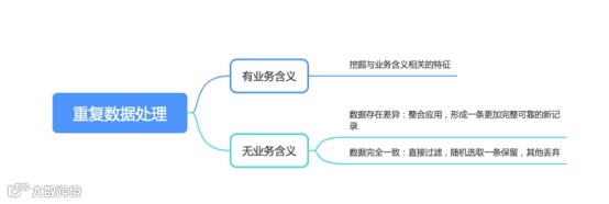 业务流程中产生的数据作为重要的数据资产,一般需要完整保存。注意,在维持数据完备性的同时,可能会引入重复数据。例如,在客户申请贷款的数据中,客户A的同一申请记录出现了2次。我们需要分析这两条数据的重复是否体现了特定的业务含义,若体现了业务含义,则挖掘此业务含义相关的特征,否则进行冗余数据处理。冗余数据处理包括直接过滤和整合应用;直接过滤是指随机选取一条数据,丢弃其他;整合应用是指将多条数据整合成或校准之后形成完整和更加可靠的新记录,然后保存使用。