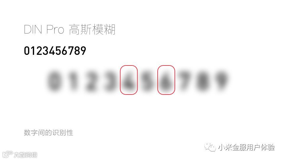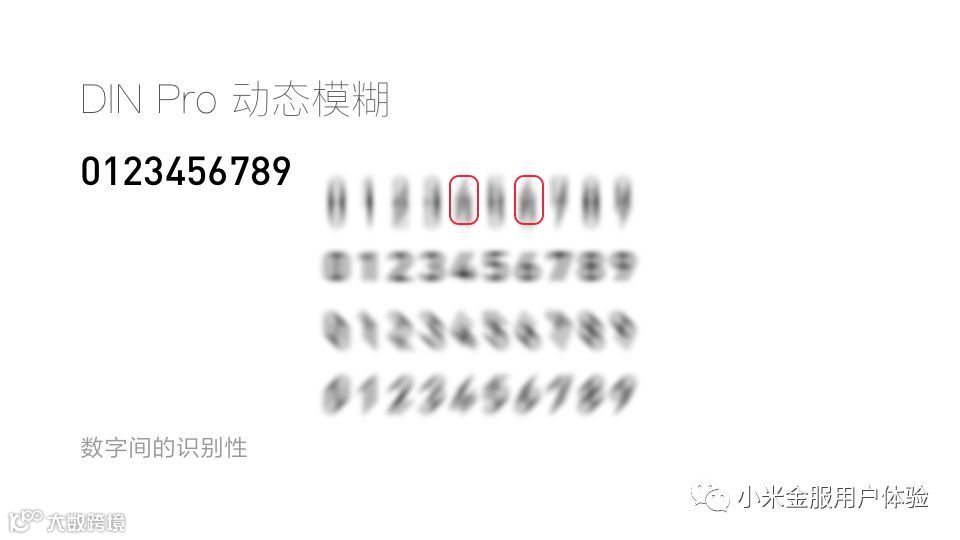 可识别性测试方法是通过对字体进行静态的高斯模糊以及动态模糊来大致判断字体在极限情况下数字之间差异性程度,例如对 DIN Pro 字体进行高斯模糊: