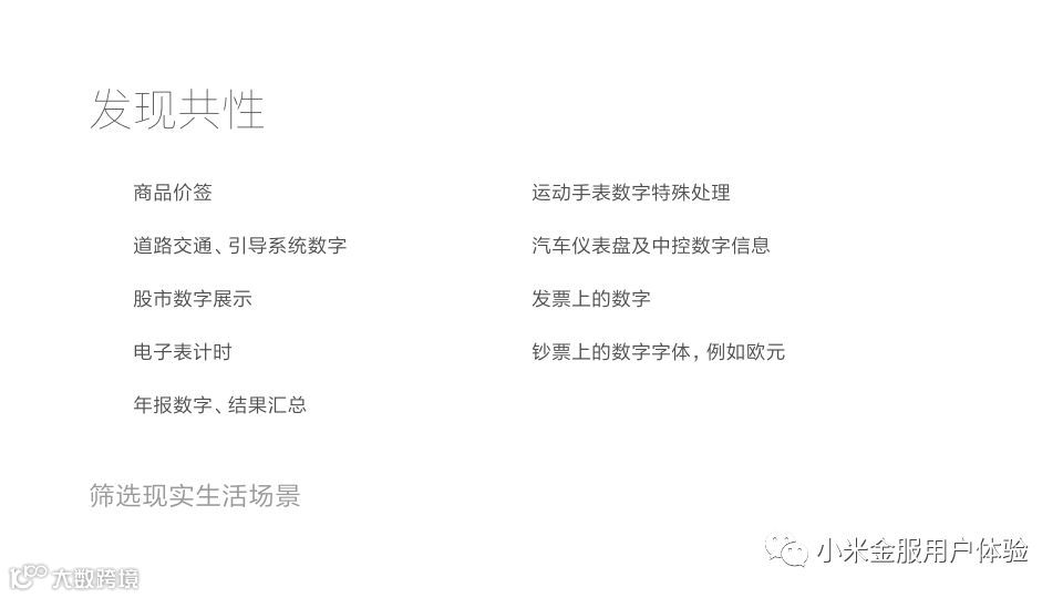 在这些实际场景中总结出数字应用的相关共性:整数与小数、可识别性、环境关系以及组合与等宽。