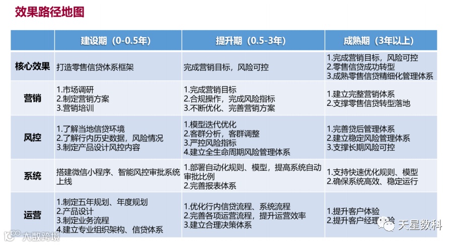 2.围绕“营销、风控、系统、运营”四大核心方面,不同建设周期,需要做的核心工作不同。至少要三年以上,才有可能让业务、流程、科技、组织人员等运营平稳。