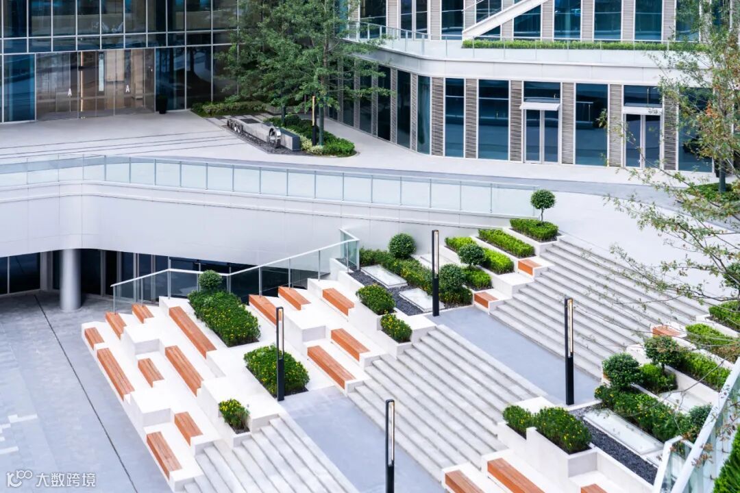 园区的建筑裙楼在垂直方向上采用逐级退台的设计,形成类似“梯田”与“山谷”的视觉效果,营造花园式办公空间,移步换景、四季不同,春夏秋冬、皆有新意。于其中办公,可以在工作间隙走到室外,享受片刻绿意盎然、静谧幽深的舒畅氛围。