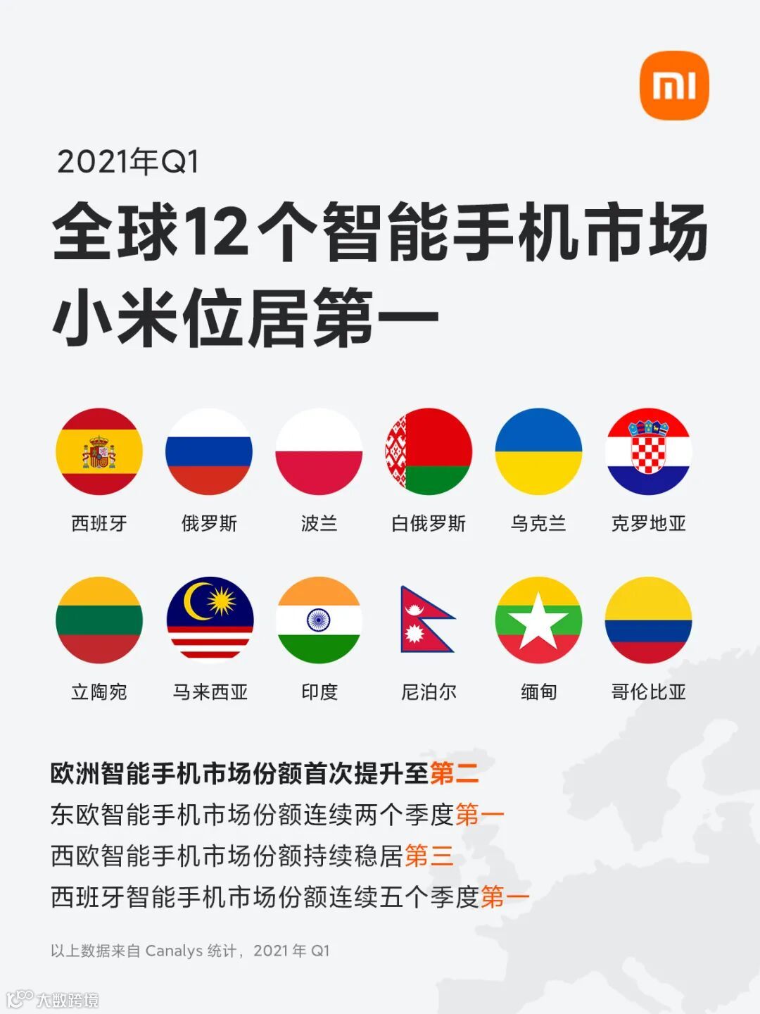 近日,市场调研机构Canalys公布了2021年第一季度智能手机市场份额,小米在全球12个国家和地区的智能手机市场排名第一,包括:西班牙、俄罗斯、波兰、白俄罗斯、乌克兰、克罗地亚、立陶宛、马来西亚、印度、尼泊尔、缅甸、哥伦比亚。与2020年第一季度相比,新增了6个国家。