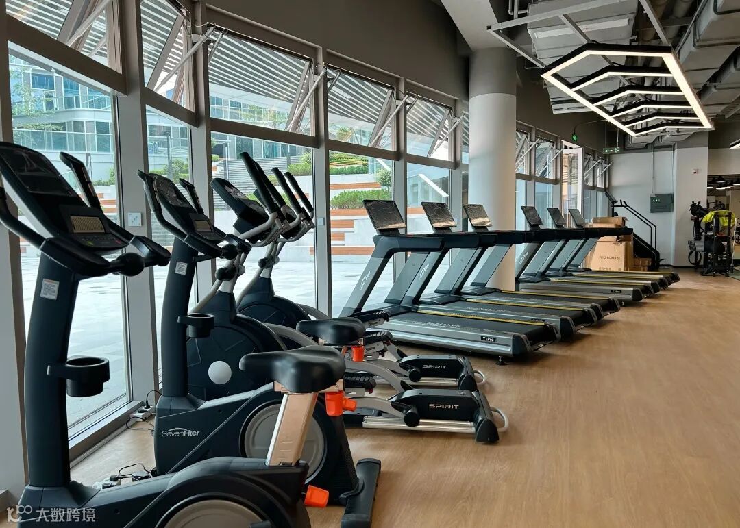 4S Fitness园区健身中心位于园区下沉广场,近600㎡的空间里配备了有氧区、器械区、普拉提室、私教区、拳击区、更衣淋浴间等功能区,6台跑步机在落地窗前一字排开,椭圆机、立式自行车、划船机、坐式推肩训练器等30多台健身设备有序排布。