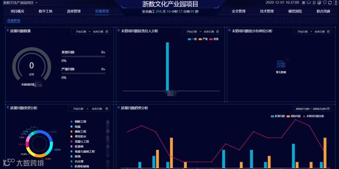 质安管理系统还能进行问题类型和趋势分析,以图表方式一一呈现,有助于管理人员分阶段、有针对性的采取整顿和预防措施,实现质量、安全管理从事后被动监管向事前主动监管、从静态监管向实时动态监管的转变,有效改善施工环境,保障施工质量安全。