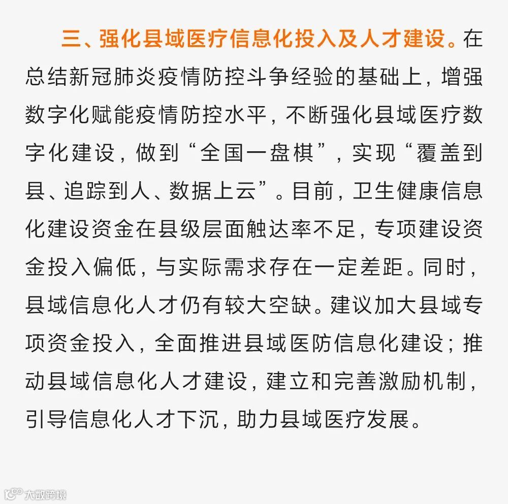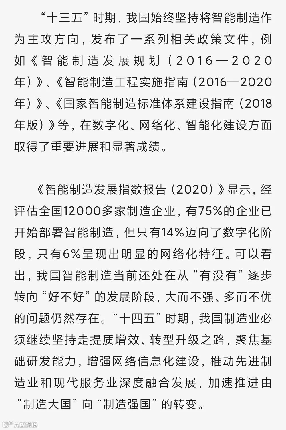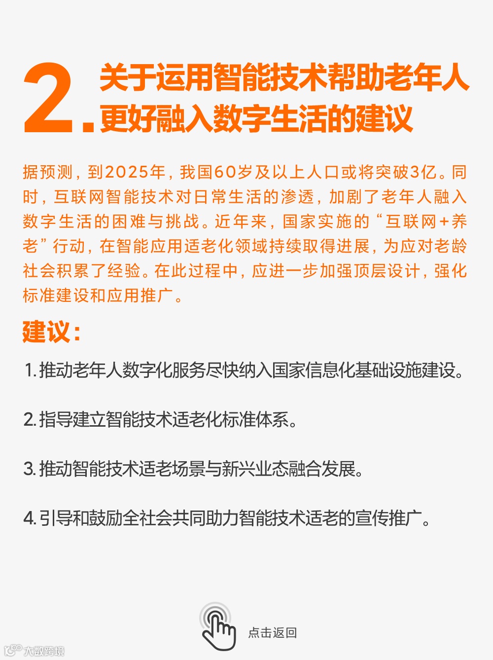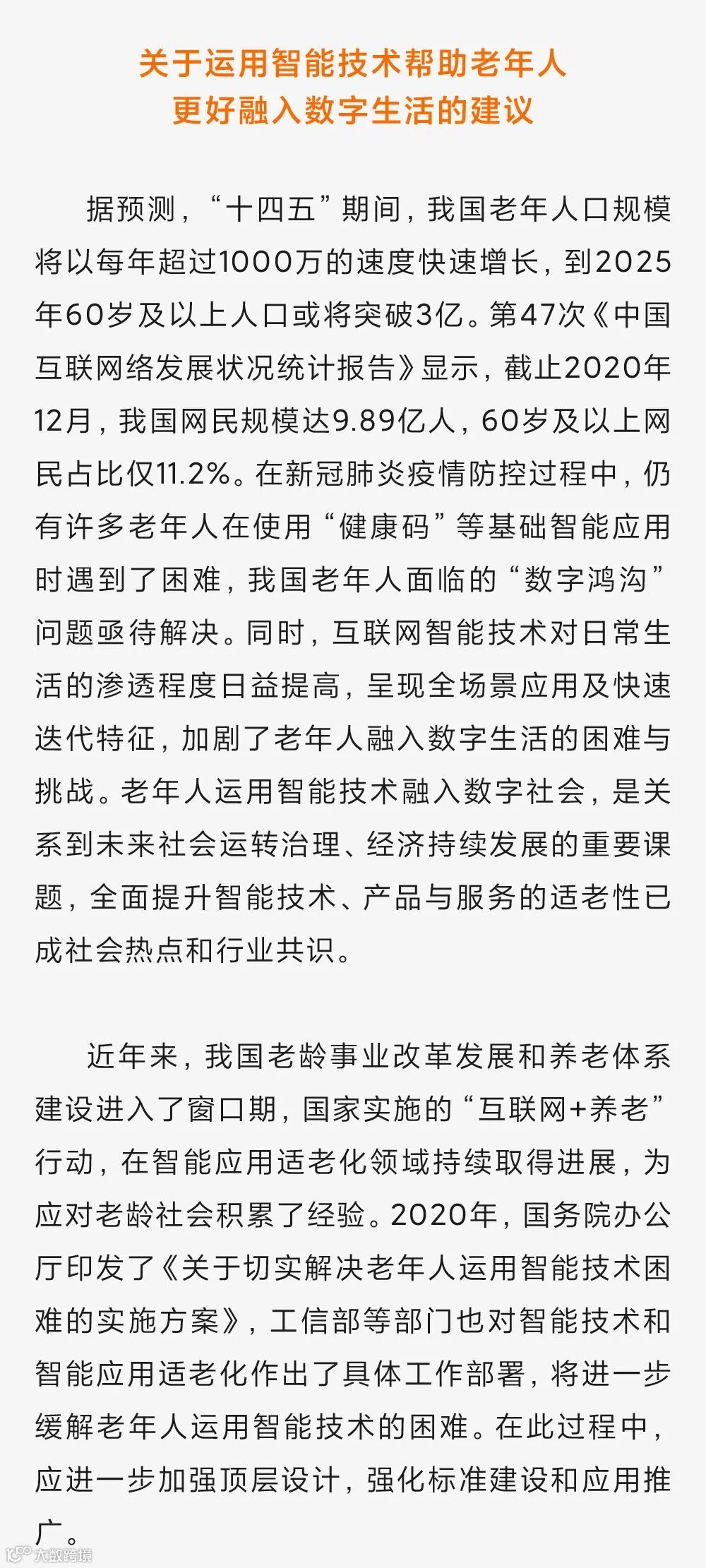 2021全国两会 雷军的三份建议 当前,智能制造已成为做大做强做优中国制造、中国创造的突破口,但我国智能制造仍然存在大而不强、多而不优的问题。“十四五”时期,我国制造业必须继续坚持走提质增效、转型升级之路,聚焦基础研发能力,增强网络信息化建设,推动先进制造业和现代服务业深度融合发展,加速推进由“制造大国”向“制造强国”的转变。 一.关于进一步推动我国智能制造发展的建议 1.营造有规划可预期的宏观政策环境,引导龙头企业更好发挥示范带动作用。 2.推动产学研协同研发,组建创新联合体,夯实智能制造装备及关键部件的基础研发能力。 3.持续培育智能制造服务平台,力争在工业软件、智能制造系统方面取得更大突破。 4.通过引进来、培养好、促转型等方式,加速填补智能制造人才缺口。 据预测,到2025年,我国60岁及以上人口或将突破3亿。同时,互联网智能技术对日常生活的渗透,加剧了老年人融入数字生活的困难与挑战。近年来,国家实施的“互联网+养老”行动,在智能应用适老化领域持续取得进展,为应对老龄社会积累了经验。在此过程中,应进一步加强顶层设计,强化标准建设和应用推广。 二.关于运用智能技术帮助老年人更好融入数字生活的建议 1.推动老年人数字化服务尽快纳入国家信息化基础设施建设。 2.指导建立智能技术适老化标准体系。 3.推动智能技术适老场景与新兴业态融合发展。 4.引导和鼓励全社会共同助力智能技术适老的宣传推广。 目前,全国县域医疗共同体已达到3346个,医疗共同体建设和县域综合医改取得了突出成效。2020年新冠疫情暴发后,全国县级医院承担了艰巨的工作任务,同时也反映出当前县域基层医疗体系仍有提升空间。在后疫情时代,加强数字化手段的运用,补短板、堵漏洞、强弱项,切实推动医防融合发展,已成为卫生健康领域的时代新课题。 三.关于加强数字化赋能县域医防融合发展的建议 1.推动县域医防数据互联共享,争取实现全覆盖。 2.鼓励运用前沿数字技术,加强医疗数据分析与应用。 3.强化县域医疗信息化投入及人才建设。