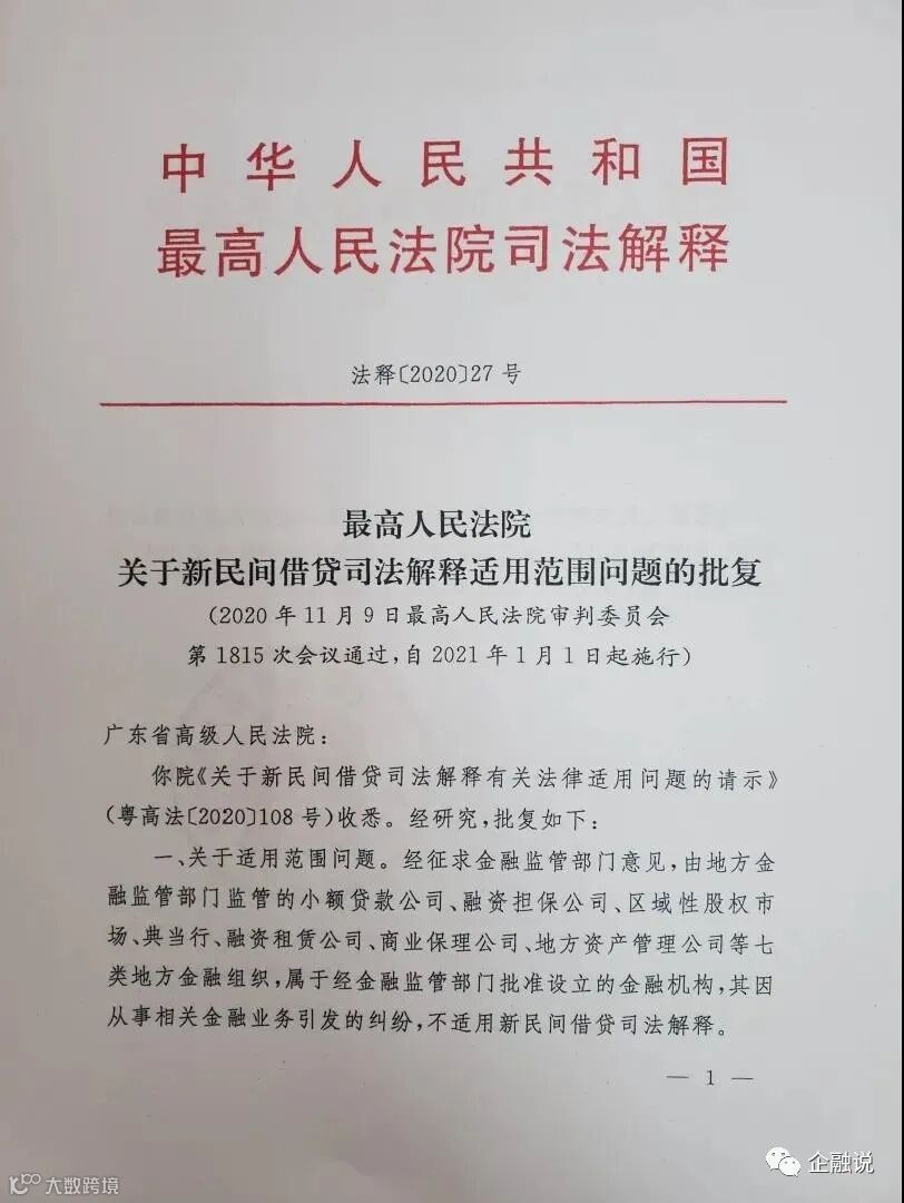 据多家信源披露,最高法院于2020年12月29日关于新民间借贷司法解释适用范围问题批复广东高院,明确: