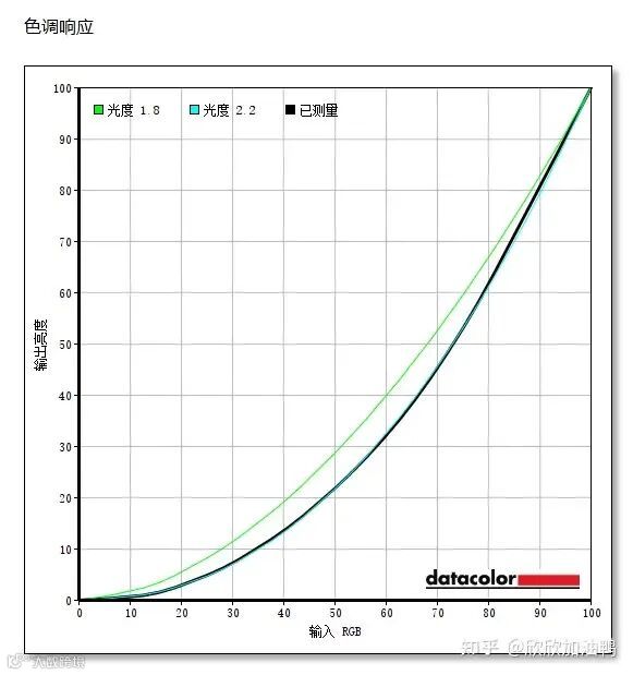 色调响应方面,实测中代表AG276QZD的伽马曲线和浅蓝色的“光度2.2”曲面几乎重合,色彩表现优秀。作为一款定位专业级的电竞显示器,拥有这样的色彩准度已经相当不错了。