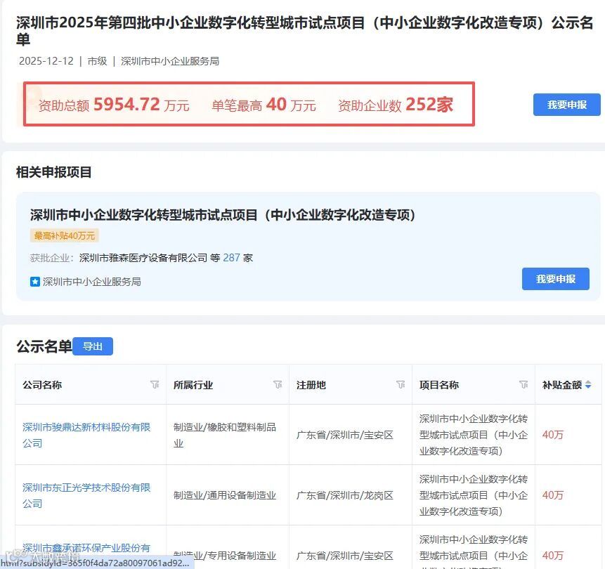 2025年12月12日,深圳中小企业服务局发布了深圳市2025年第四批中小企业数字化转型城市试点项目(中小企业数字化改造专项)公示名单,资助企业高达252家企业,资助总额达5954.72万元,单笔资金最高可达40万元(多家企业获得)