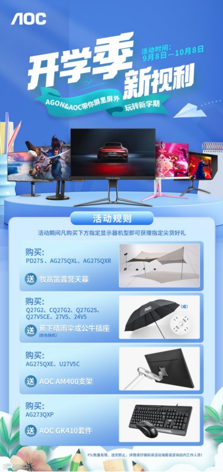 9月,天气逐渐转凉,众多学子即将开启新的学期,AOC以多款尖货护航开学季的同时,亦为您带来了最适合初秋出行游玩的最佳装备,现在购买AOC&AGON对应显示器,即有机会获赠牧高笛天幕、蕉下睛雨伞等轻奢好物,助您屏里屏外纵享品质生活!