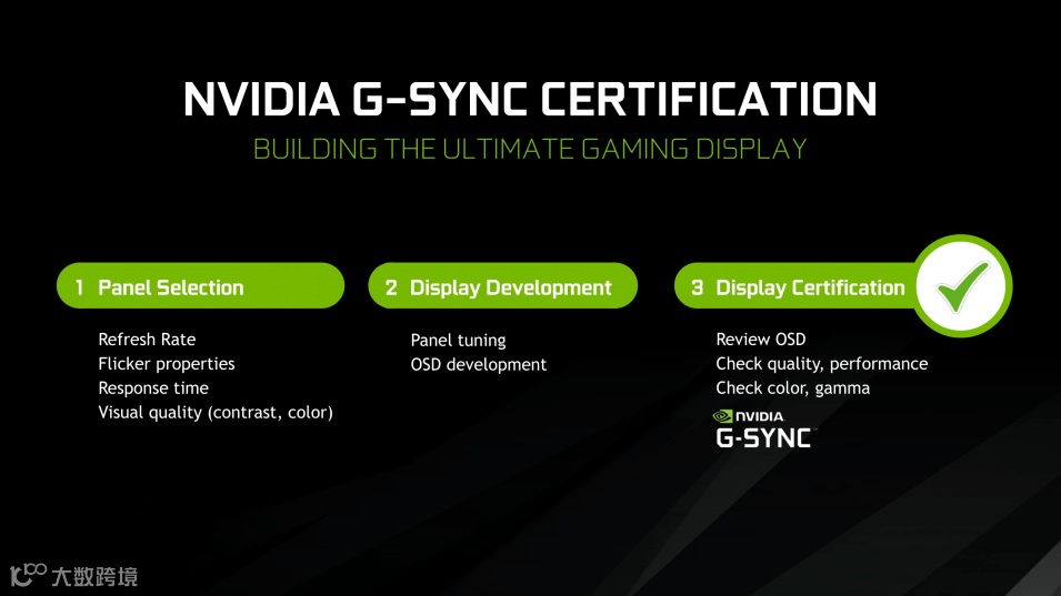 不仅如此,NVIDIA还参与了G-SYNC显示器的面板选择和开发,在显示器出厂后,NVIDIA还会对显示器进行检测,确保通过质量认证。至此,G-SYNC不仅是一项防撕裂技术的认证,而是化身为优质电竞显示器的标签,只要拥有G-SYNC认证的显示器,就能收获极致的游戏视觉体验。