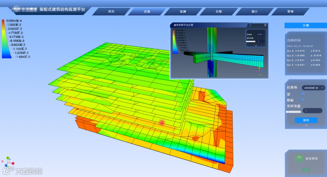 云庐科技从事建筑行业智能监测技术开发及应用多年,具备丰富的行业经验以及市场领先的核心技术,公司核心技术和管理人员均来自于清华大学、中国科学院等知名院校,团队具有20年CAE的研发经验,100多项软件著作权。成立以来,公司与清华大学、澳门大学、北京工业大学、中国水利水电科学院等知名研究机构开展了深度的技术合作,与华为、阿里、中国地震局、中国铁建、中国交建等展开了广泛的应用和项目合作,先后承担了国家会议中心二期钢桁架卸载监测项目、苏州工业园区体育场项目(屋面索网结构索力、外围V型立柱应力、屋面震动及外部荷载进行全面监控,并提供实时反演计算和自动报警)、青岛地铁1号线遵义路站~瑞金路站智能监测项目(机器学习预测拱顶沉降、结构反演分析初衬内力变化)、中国地震局超大规模地震实时流处理项目、170m超高塔筒风机和叶片的吊装施工咨询项目、厦门新体育场钢结构智能监测系统、中国科学院重庆科学中心装配式建筑等智能监测系统等。其中中国科学院重庆科学中心装配式建筑为混凝土装配式建筑,智慧监测系统针对混凝土装配式建筑重点关注的连接节点进行24H有针对性的监测,充分考虑了装配式建筑的特点。还通过CAE仿真等手法,计算分析整个结构和关键节点的受力状态。