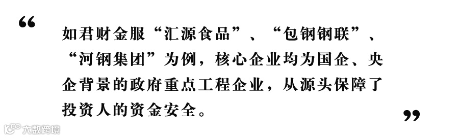 如君财金服围绕供应链核心企业,以真实交易背景为基础,对融资企业运营状况、资信、盈利能力等各环节展开严格地筛选、考察,通过来自核心企业与借款企业的综合信息,最大限度把控了业务的风险。
