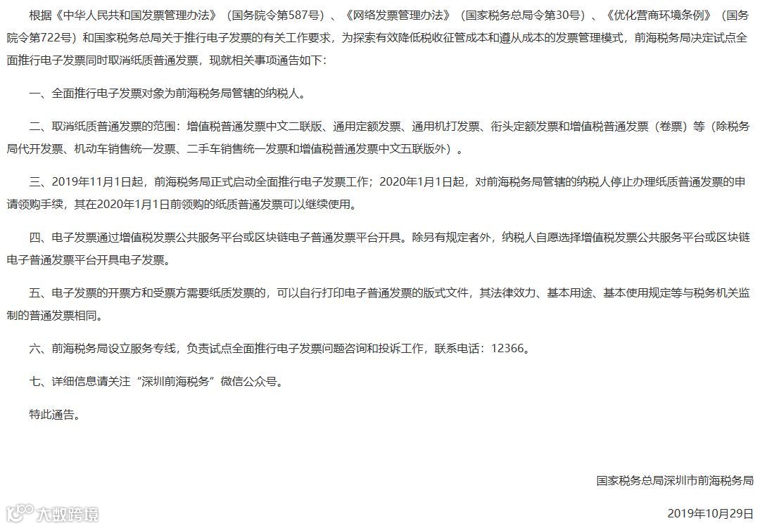 重磅!深圳前海税务局正式宣布2020年1月1日起,告别纸质发票,也就是说再过不到两个月,深圳前海纳税人将告别纸质增值税普通发票,全面使用电子发票。