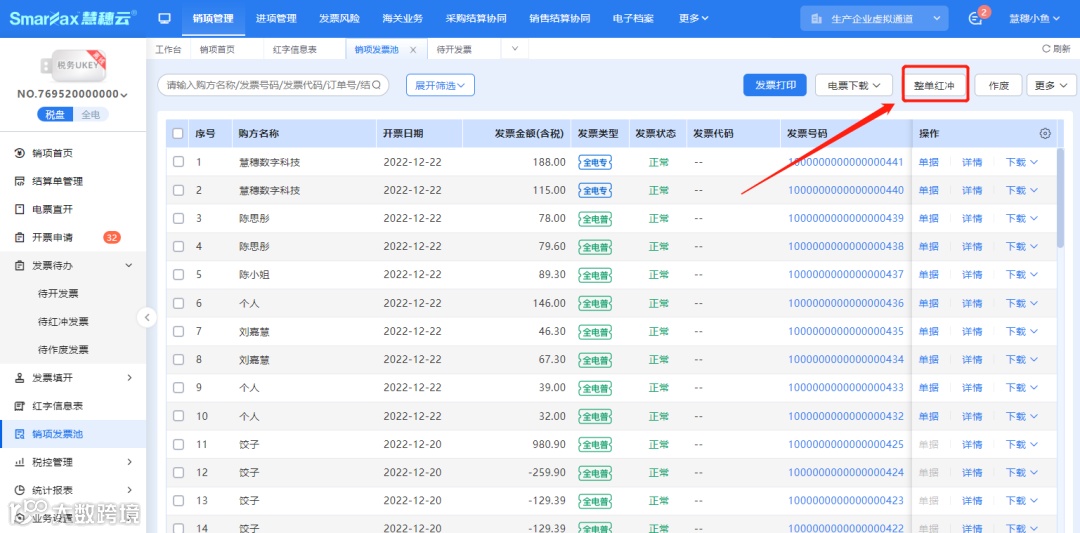 2、勾选发票——点击整单红冲——确定红字信息表内容——填开并上传