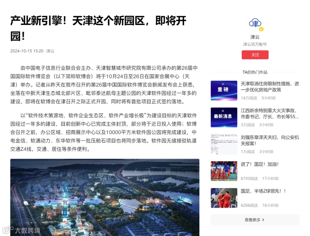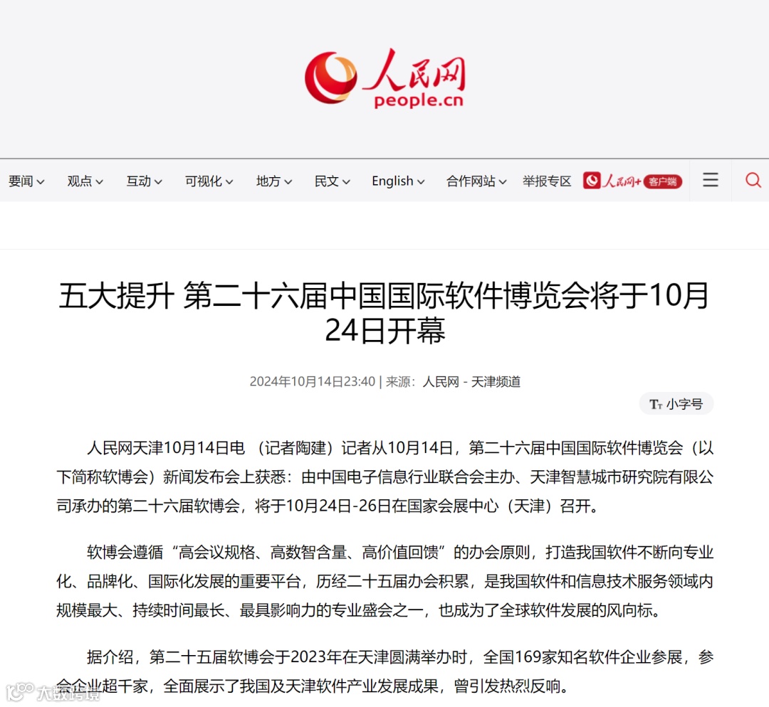 10月14日,第二十六届中国国际软件博览会新闻发布会召开。作为本届软博会重要亮点之一,天津软件园迎来重要时刻,将在本届软博会期间开园。新华社、人民网、央广网、中新网、天津政务网、天津日报、天津新闻、天津发布、津云、北方网、天津广播、天津国资、天津外资、滨海发布等多家主流媒体进行了相关报道。