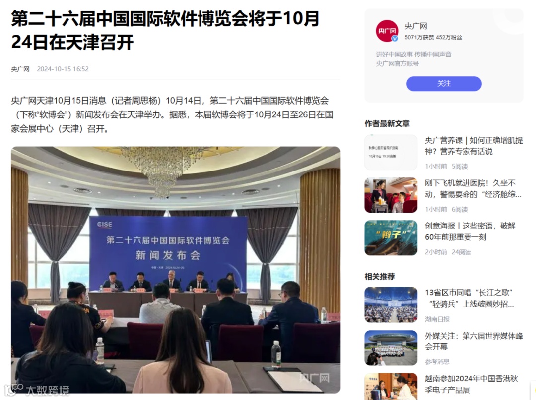 新华社客户端天津10月15日电(记者郭方达)日前,第二十六届中国国际软件博览会(下称“软博会”)新闻发布会在天津举办。据悉,本届软博会将于10月24日至26日在国家会展中心(天津)召开。