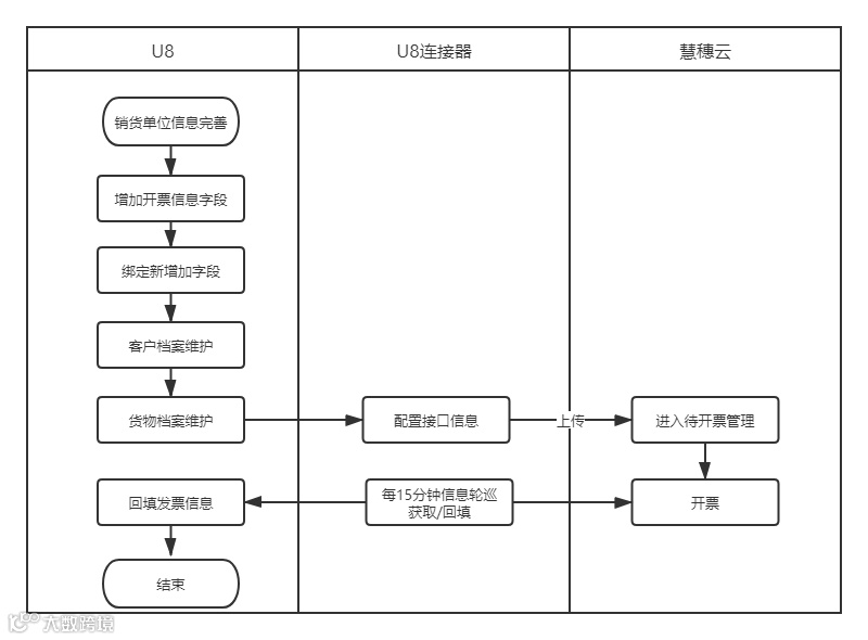 企业U8管理系统,通过API接口对接慧穗云税务平台。企业通过U8提交开票申请,通过API接口传送到慧穗云,慧穗云根据上传信息直接开具发票,API接口每15分钟轮循获取开票信息回传U8。系统自动进行开票信息准确集成精确匹配且关联订单。